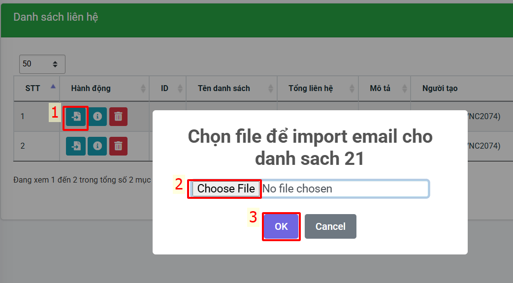 2.4 Bấm vào icon Import để tiến hành import danh sách liên hệ đã nhập vào file excel mẫu trước đó , sau đó bấm OK