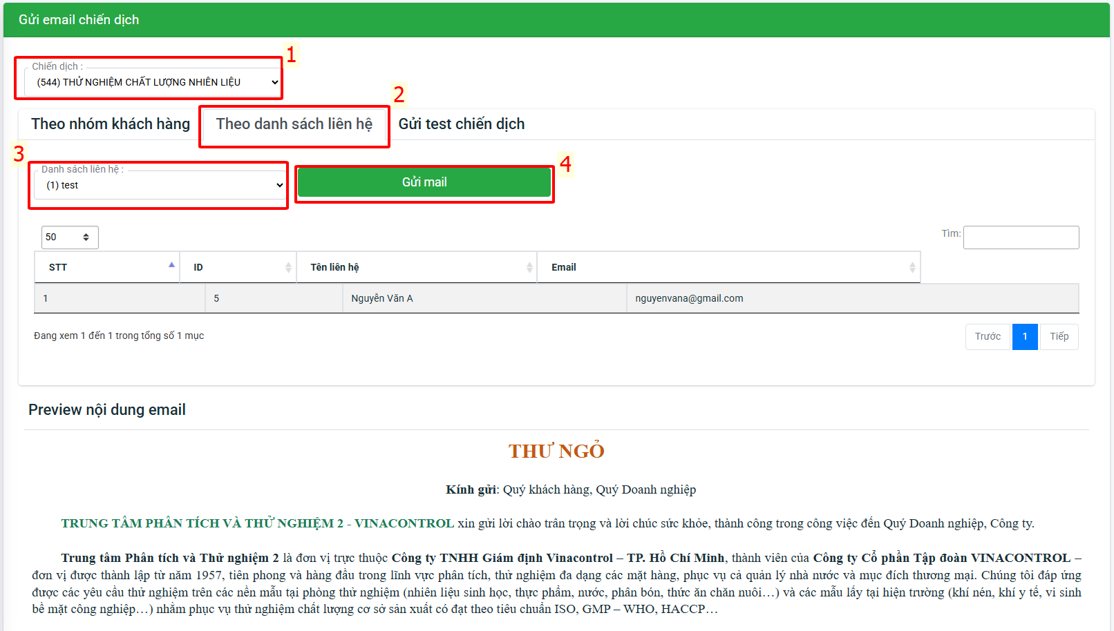 - Chọn danh sách liên hệ muốn gửi -> hiện ra danh sách email tương ứng