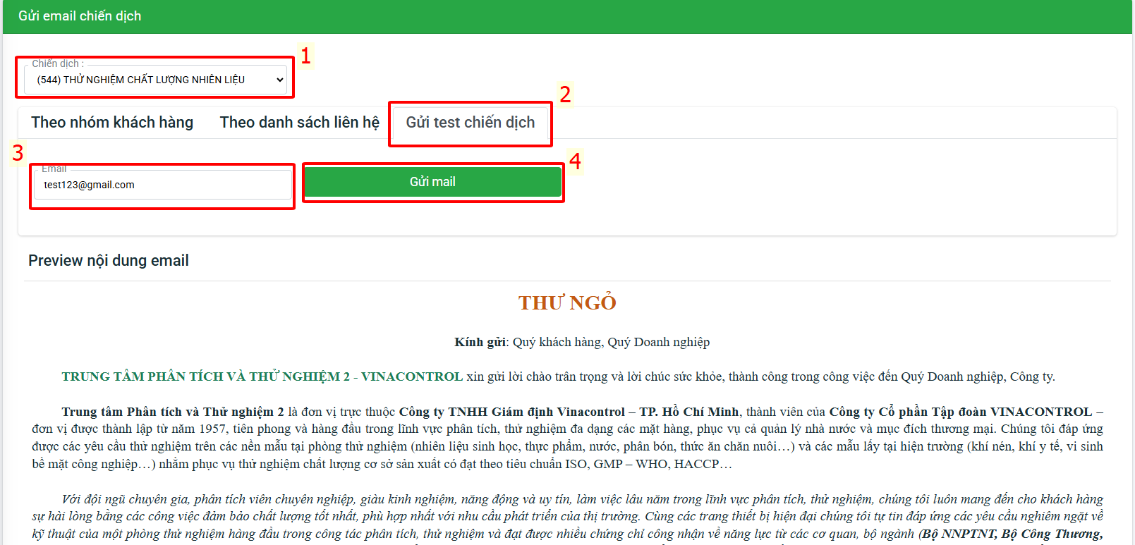 - Nhập email muốn nhận chiến dịch test vào ô Email