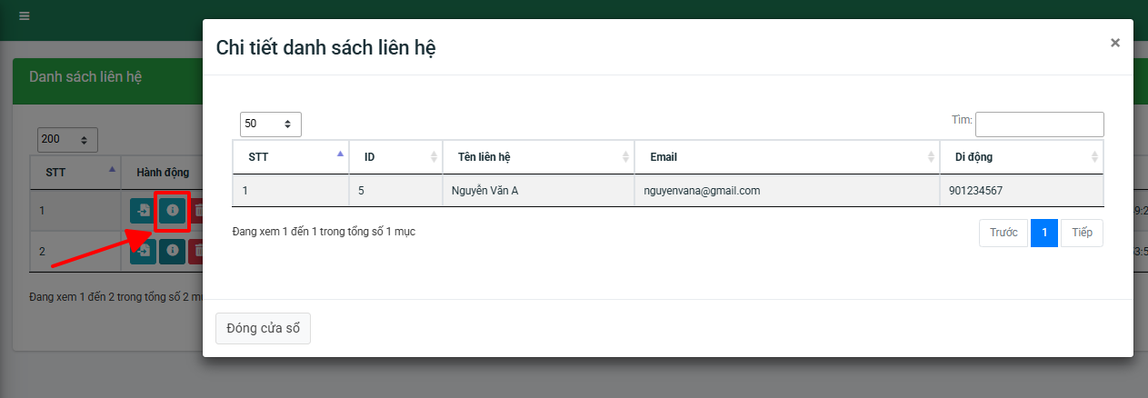 2.5 Bấm vào icon chi tiết để xem danh sách đã import vào danh sách liên hệ.